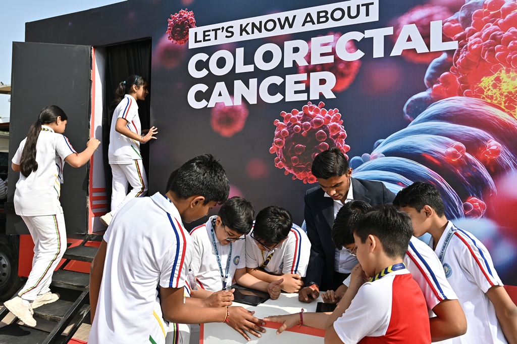 This mobile exhibition featured interactive displays, anatomical models, and educational materials to help students understand the causes, symptoms, diagnosis, treatment, and prevention of colorectal cancer. A screening of a specially curated animated video simplified key concepts, and further students enthusiastically took part in the online quiz.