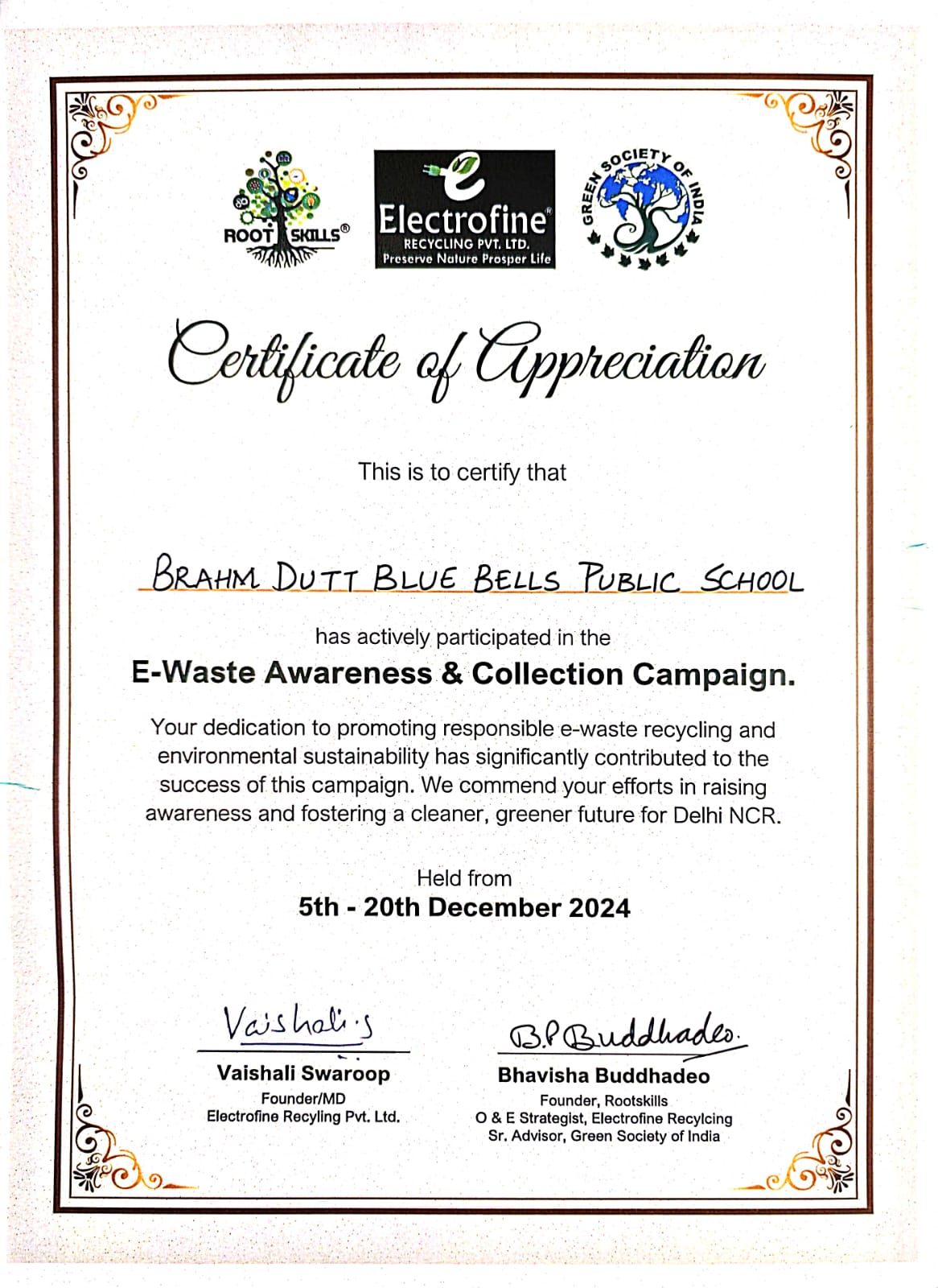 Brahm Dutt Blue Bells Public School has been a proud recipient of Certificate of Appreciation for its exemplary contribution as a proud partner in the prestigious Generation Green 2024. Spearheaded by OPPO India in collaboration with AICTE,
