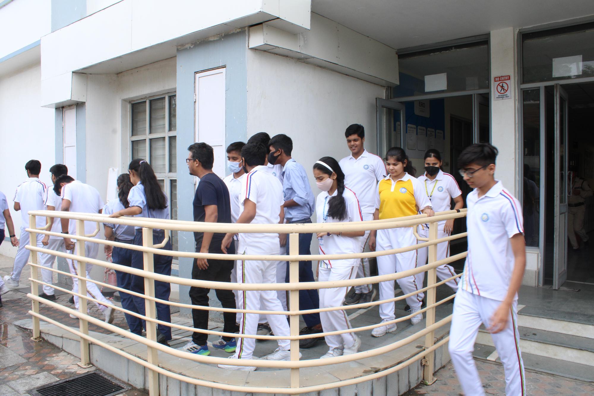 leave their classes and evacuate the school building. Guided by the teachers,