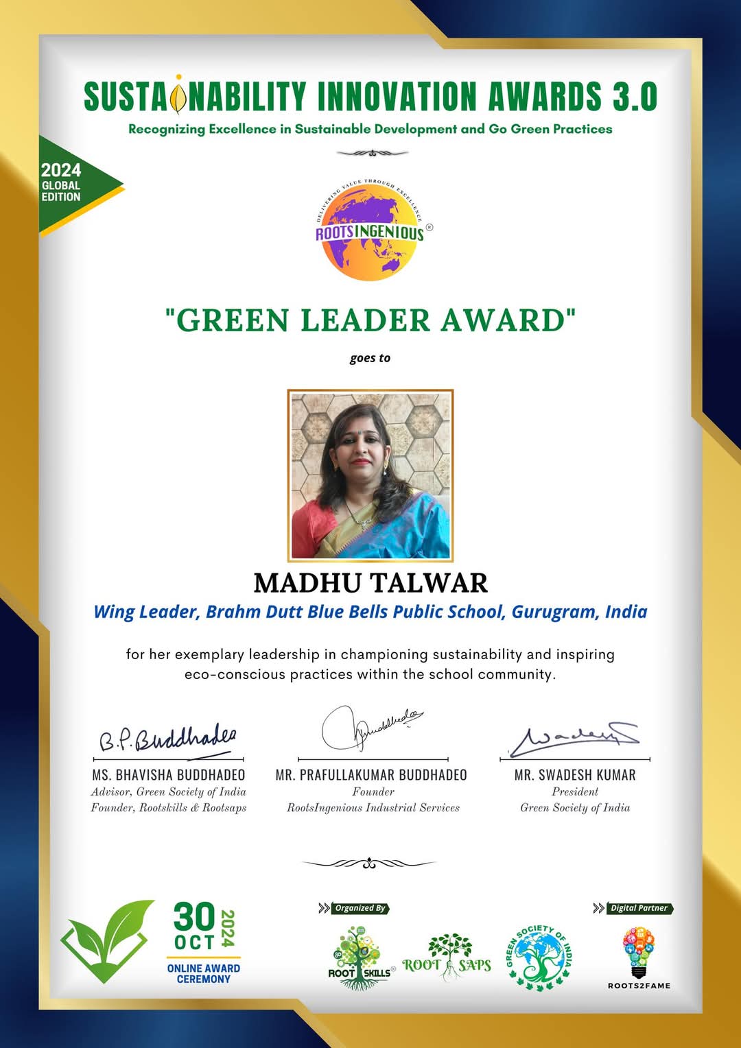 The Sustainability Innovation Awards 3.0 organised by Root Skills, Root Sap, Green Society of India, and Roots2Fame is a celebrated platform that shines a spotlight on groundbreaking efforts to build a greener future. This virtual event recognizes trailblazing leaders and institutions that inspire transformative change across sectors.
