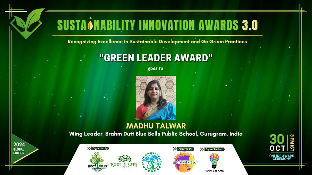 This commitment bore fruit as our school proudly clinched the prestigious Green School Award at the Sustainability Innovation Awards 3.0. Adding to this proud moment, Ms. Madhu Talwar, Middle Wing Leader, BDBBPS, was honoured with the Green Leader Award for her exceptional leadership in championing sustainable practices.