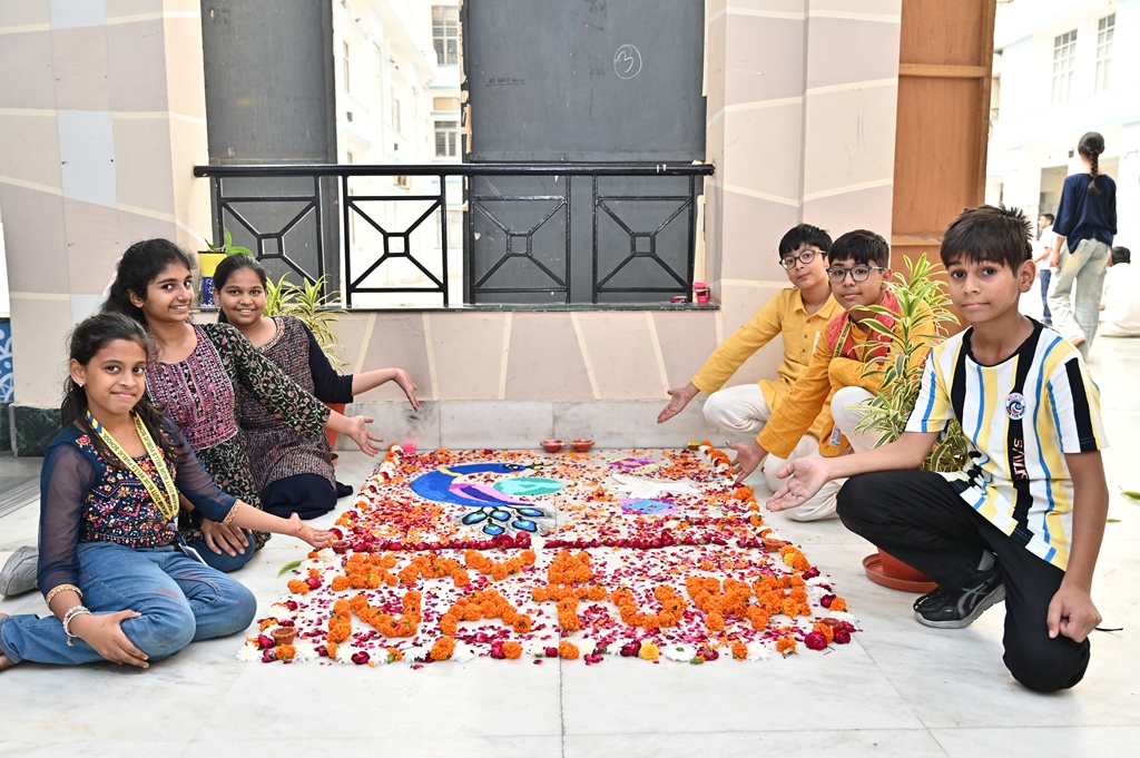 In a radiant celebration of Diwali, the Primary Wing came alive with colours and creativity during the Inter-House Rangoli Competition. Young artists poured their imagination onto the floor, weaving breathtaking patterns that beautifully captured the theme “Illuminate Nature, Celebrate Peace.”